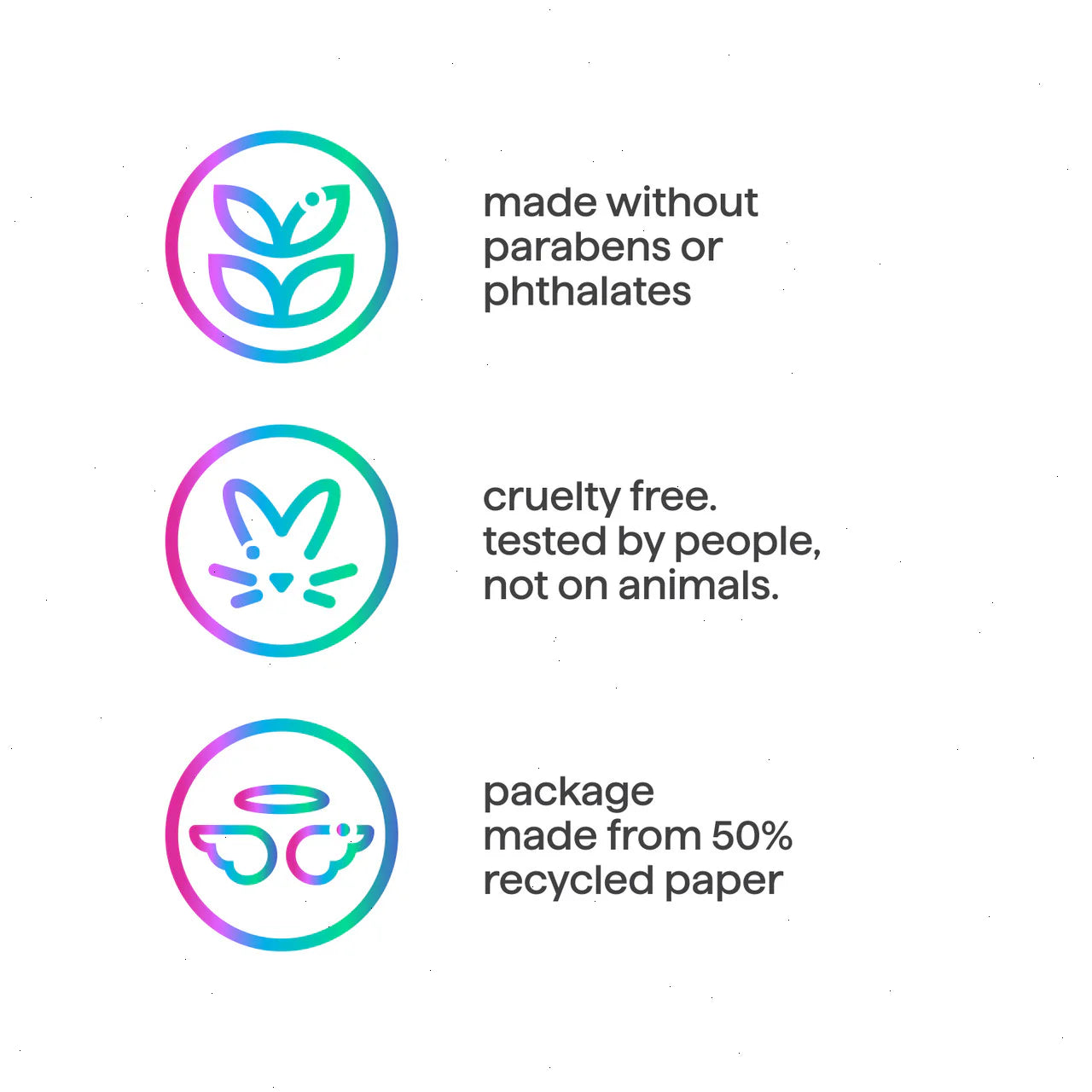 • cruelty free. tested by people, not on animals.