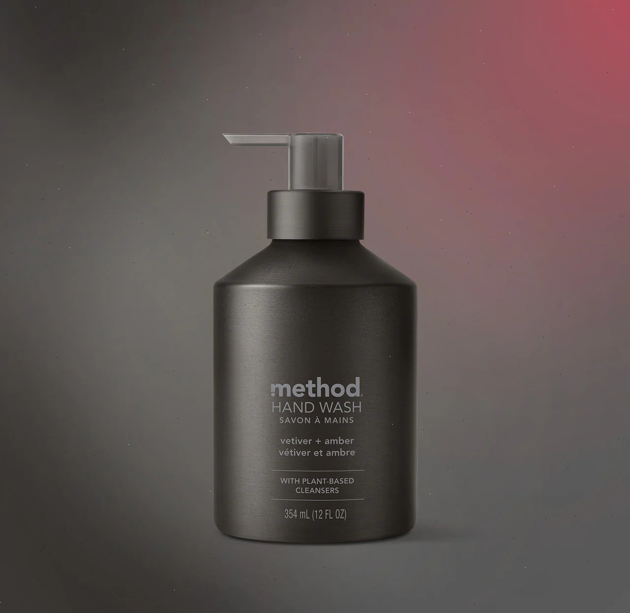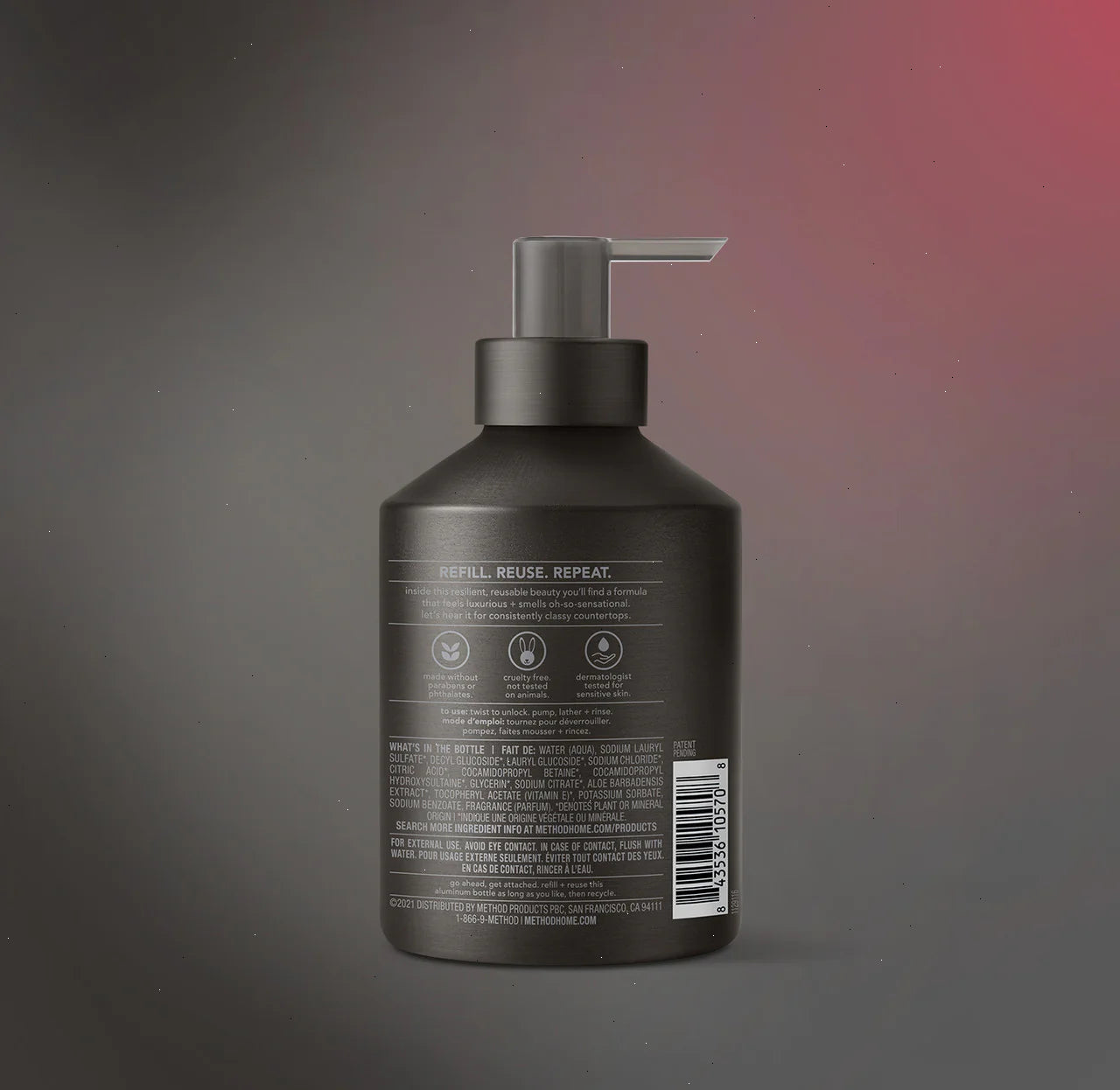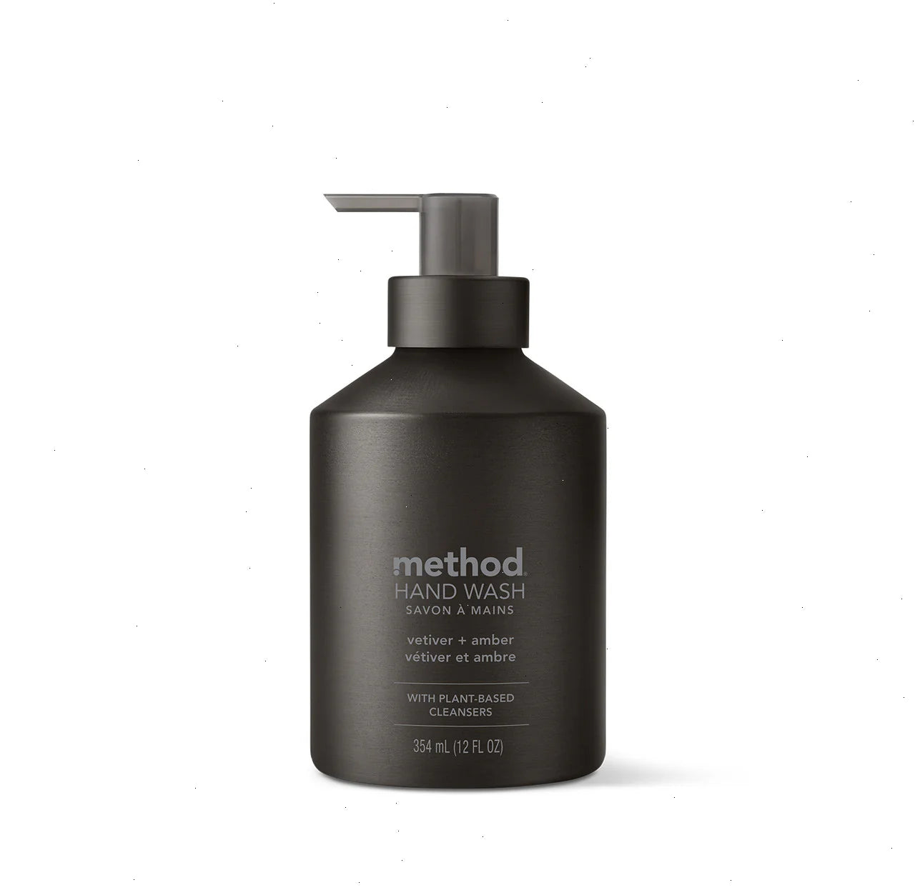 fall in love with method’s luxurious vetiver + amber gel hand wash in a refillable black aluminum soap dispenser. created with thoughtfully chosen cruelty-free ingredients without parabens or phthalates. this reusable hand soap will elevate your mood with its rich, smokey notes of vetiver and sweet notes of amber. leaving you with a comforting woodsy aroma. check out other vetiver + amber products.